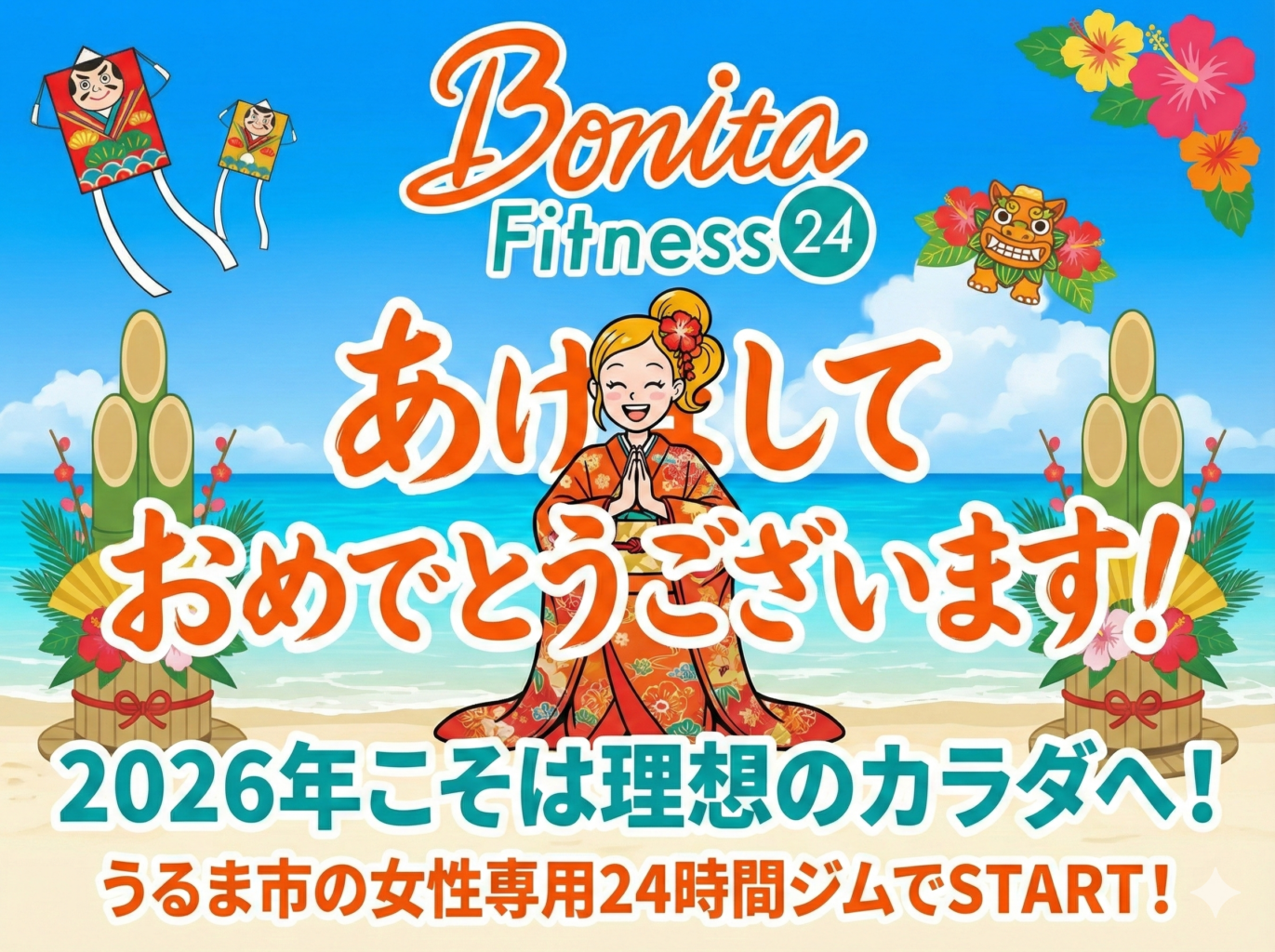 うるま市でジムをお探しなら、ぜひボニータフィットネスみどり町店へ遊びに来てくださいね。 ロゴキャラクターの「ボニ子」と一緒に、スタッフ一同お待ちしております!